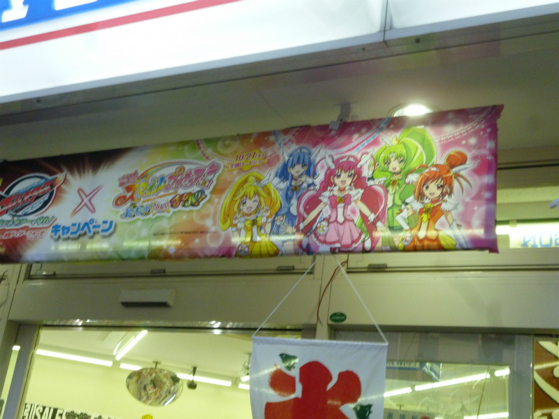 (駅前のローソンに「スマイルプリキュア(という、「大友(←大きなお友達の略です)が俗に言う、土曜32時30分からやっている」アニメ)とのタイアップ企画の旗がありました。